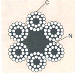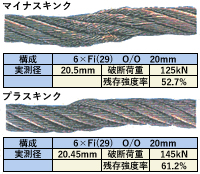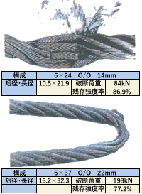| 断線 | 全長、全周にわたり断線の有無を点検する。 ある場合は、山切れ谷切れの状況を入念に調査し断線本数を数える。 ![]() C:クラウン断線(ロープ外接円と接する部分〔山断線〕の断線 N:ニップ断線(ストランド相互が接する部分〔谷断線〕の断線) |