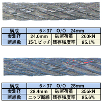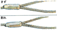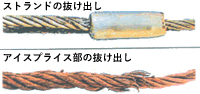 | 抜け出し | ・アイスプライス:ストランドの抜け出しの兆候がないか点検する。 ・アイ圧縮止め:片端に凹みが生じたり、抜け出しの有無を点検する。抜け出しの点検は目視、マーキング等による。 |