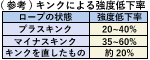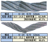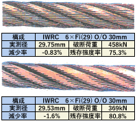| 磨耗 | 全長、全周にわたり摩耗の状況を点検する。 | 素線と素線の隙間がなくなったもの。 (右表の減少率は公称径に対する値) |