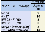 [クラウン断線(山切れ)の場合] ロープ径(d)の6倍(約1ピッチ)の範囲内の断線を数え、使用されているワイヤーロープの構成を確認して下表の断線以上あるもの。 ![]() 《ニップ断線(谷切れ)の場合1本であるもの》 |